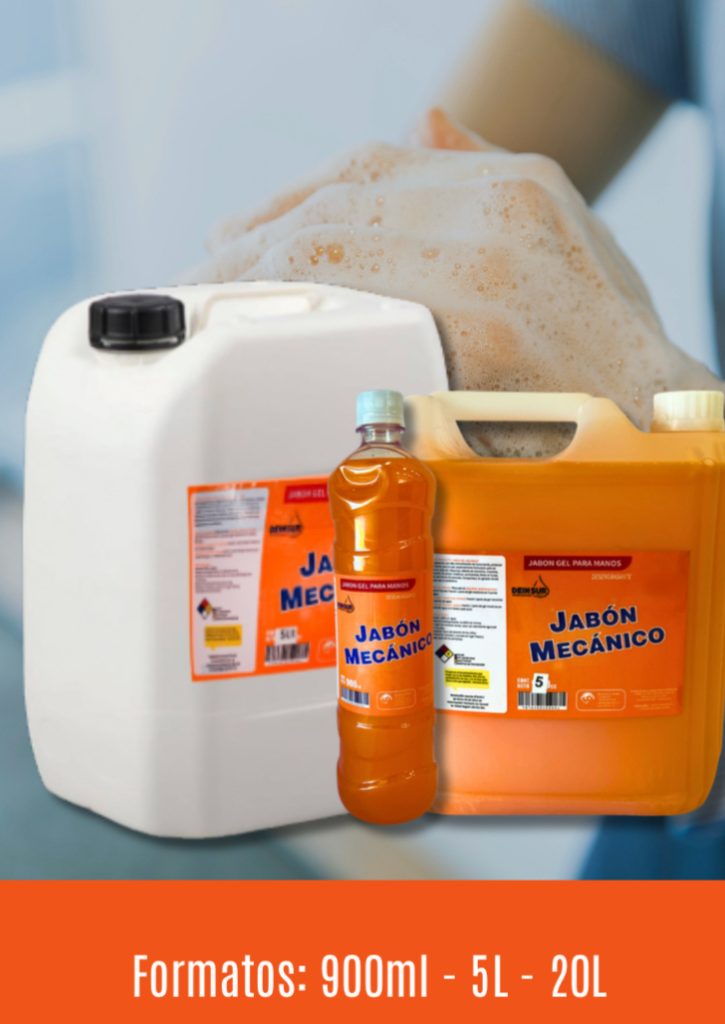El jabón mecánico es una formulación desengrasante de alta concentración que proporciona a la piel: humectación, protección cutánea y suavidad. El producto es especialmente indicado para ser utilizado por personas que trabajan en: salas de máquinas, talleres mecánicos, imprentas, fábricas de piezas metálicas, servicentros, flotas de buses, fábricas de harina de pescado, cualquier vehículo de transporte y en general, donde la grasa sea un problema.